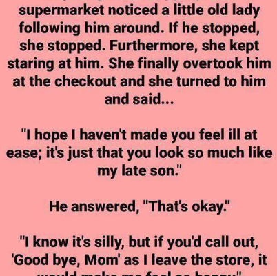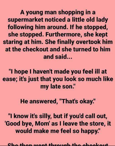 A young man noticed an elderly lady following him around while shopping in a supermarket. She stopped when he stopped and kept staring at him. Eventually, at the checkout, she approached him and said, “I hope I haven’t made you feel ill at ease; it’s just that you look so much like my late son.”