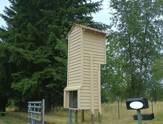 Along a quiet rural road north of Gresham, Oregon, drivers often notice a tall, slender wooden tower standing at the end of a driveway. About fifteen feet high, the structure has beige siding, a small pitched roof, and a glass panel facing the road. It isn’t a treehouse, feeder, or mailbox—it’s something much more practical. Locals call it a “driveway periscope.”