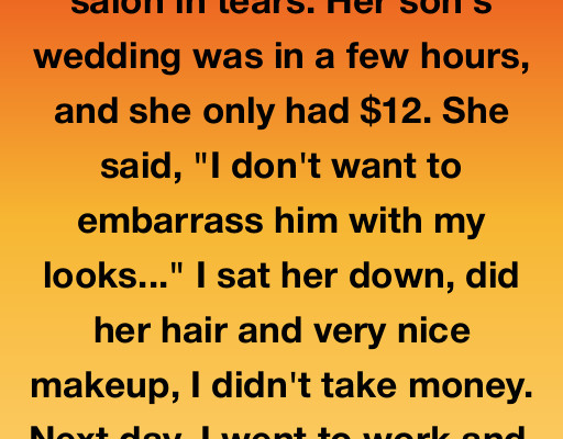 She came in with swollen eyes and twelve dollars. “My son’s wedding is in a few hours,” she whispered. “I don’t want to embarrass him.” Her cardigan was worn, shoes tired, but her gaze steady. I set aside her money and said, “Sit. Let me take care of you.” I curled soft waves into her gray hair, shaped her brows, pressed a rose tint into her lips. When she saw herself in the mirror, she smiled. I refused her twelve dollars. “Go enjoy your son.”