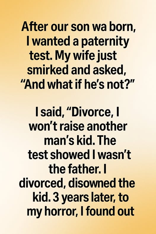 After our son was born, I wanted a paternity test. My wife just smirked and asked, “And what if he’s not?” I said, “Divorce, I won’t raise another man’s child.” The test showed I wasn’t the father. I divorced, disowned the child. Three years later, to my horror, I found out…