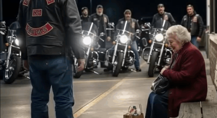 Just then, the sound of engines broke the silence. A group of bikers pulled into the parking lot. They were members of a motorcycle club—Savage Angels MC—with leather jackets and tough expressions that might have made others turn away. But one of them, a large man with a beard and kind eyes, noticed Margaret sitting alone. He walked over slowly and knelt beside her.