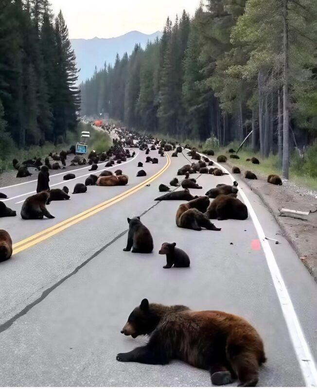 The entire road was covered with… bears! Big and small, black and brown — they were simply sitting or lying right on the asphalt. Terrified, I went back to the car, but then I realized the bears weren’t even moving or paying attention to people. They behaved very strangely.