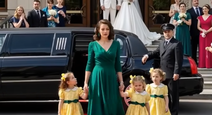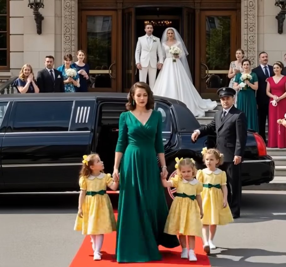 But fate had its own script. As guests admired the décor and the bride’s pearl gown, a sleek limousine rolled up outside the hotel entrance. Conversations stilled, and curious eyes turned toward the door. Three identical little girls stepped out first — bright-eyed and smiling in matching yellow dresses — followed by a woman in an emerald gown that seemed to glow under the setting sun. It was Emily. Poised, confident, radiant. The whispers spread instantly. Cameras flashed. Daniel’s self-assured grin vanished as she approached, greeting him with calm grace. “Congratulations, Daniel,” she said softly, her tone neither bitter nor boastful — simply resolute.
